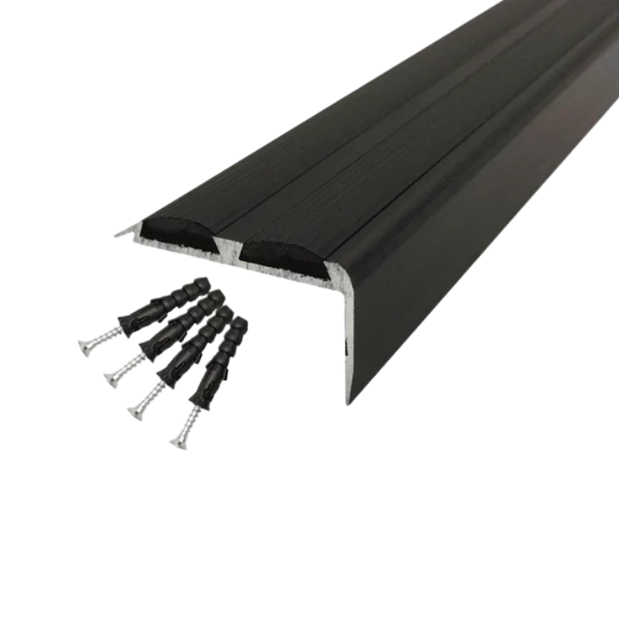 Fitting is straightforward using the supplied plugs and screws. For installation, lift out the rubber insert, secure the nosing through the pre-formed holes, then refit the insert for a tidy finish with no visible fixings.