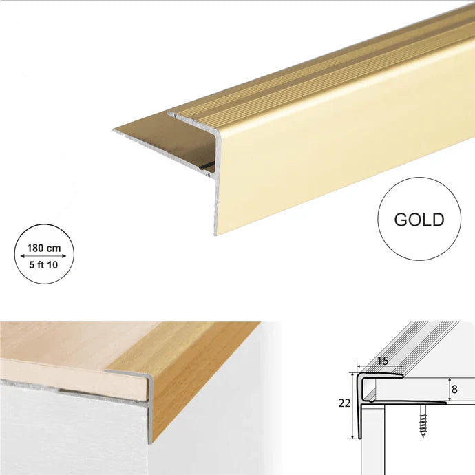 Finish stair step edges with a neat aluminium profile designed to suit laminate and wood flooring. This 15 x 22mm anodised aluminium stair nosing uses a push-in style profile to help create a clean transition at the step edge, while also covering small imperfections and helping reduce edge wear.