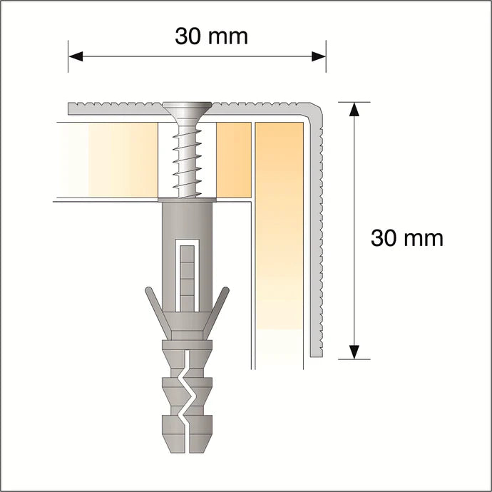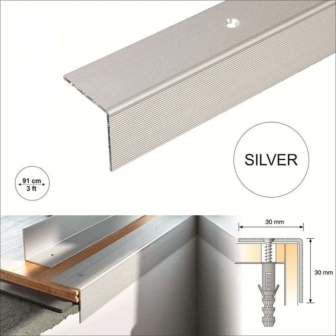 30 x 30mm Anodised Aluminium Stair Nosing – Ribbed Anti-Slip Edge Trim (Screw Fix, Silver or Gold)