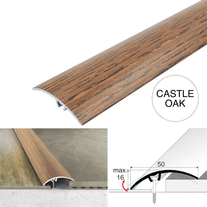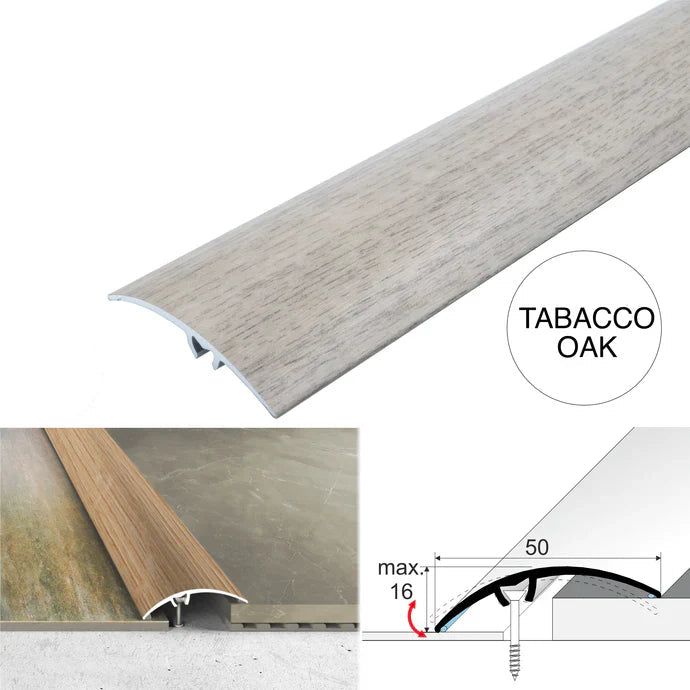 The broad 50mm profile offers generous coverage, supporting stable movement across adjoining areas in both home and commercial settings. A concealed screw-fix mechanism allows the trim to lock firmly into place while keeping the surface clear of visible fasteners, giving the threshold a clean and uninterrupted appearance.