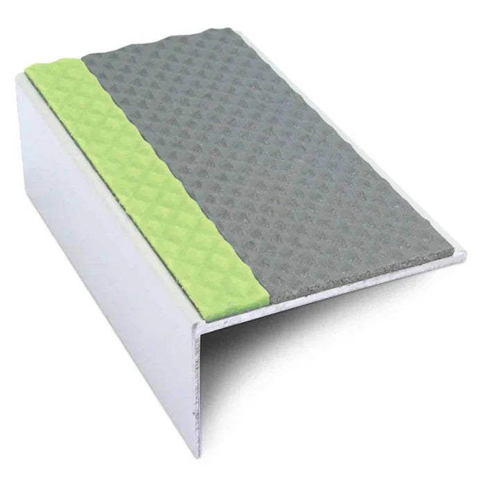 56 x 32mm Straight Edge Stair Nosing Aluminium Profile with Tredsafe PVC Insert and Aluminator Glow