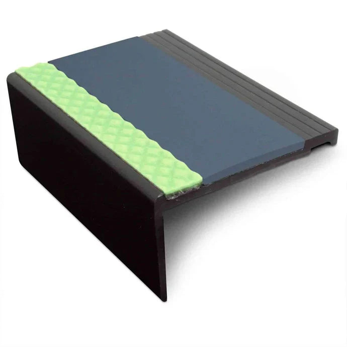 Alongside the non-slip insert, the profile includes a photoluminescent glow strip that absorbs natural or artificial light and glows in darkness. This helps keep stair edges easier to see during low-light conditions, including power loss, without any wiring.