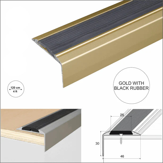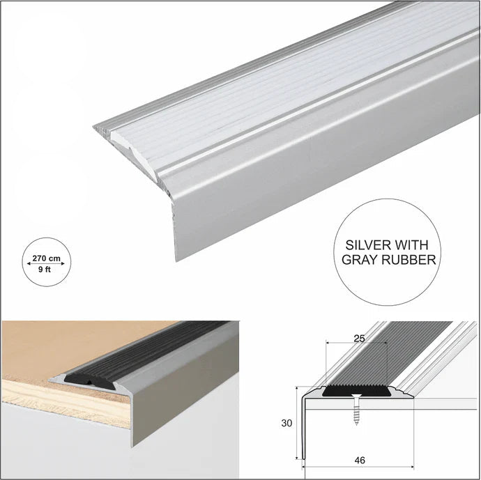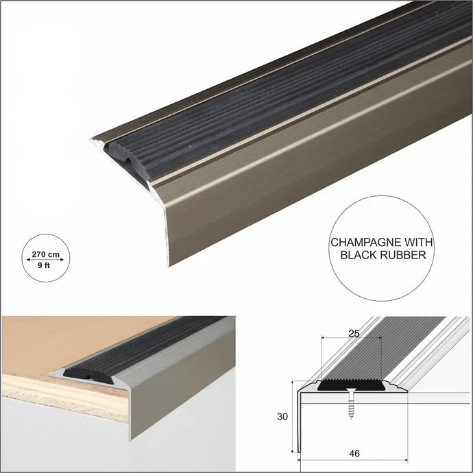 Straight Edge Stair Nosing Trim (46 x 30mm) – Anodised Aluminium with Non-Slip Rubber Insert